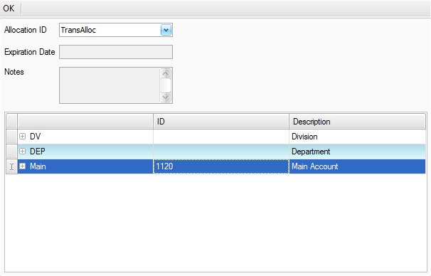 - Click the Allocation button to assign a transaction allocation ID to the transaction, or select the Allocation ID to associate with the transaction. The allocation’s description, expiration date, and related notes appear.