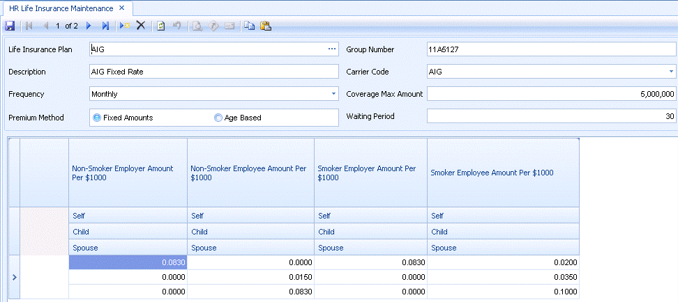 For the Fixed Amount premium method, you will enter only one group of premiums for self, spouse, and child.