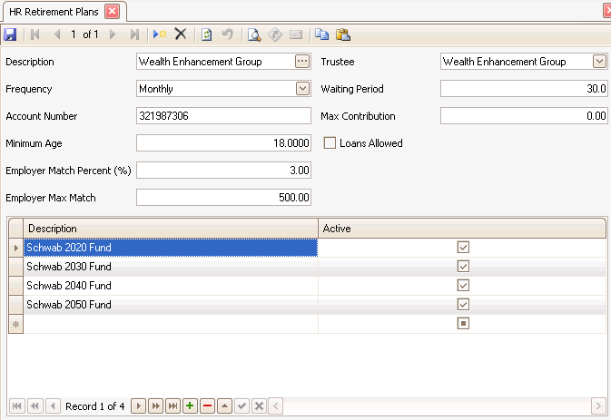 - Set up the company providing the plan by setting up the retirement trustee and description in Setup and Maintenance by choosing Retirement Trustees in the Table Code field.