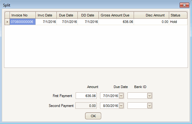 The Split dialog box appears when you select Split on the Hold/Release Invoices screen.