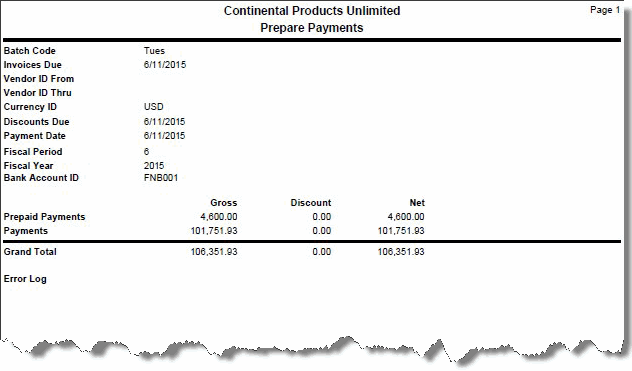 Note: You can prepare more than one batch if needed, printing and posting each batch independently of the others. - Select a due date for the invoices from the Invoices Due field. All invoices with a due date on or prior to this date will be included in the prepare payments, for the range of vendors selected, and have a status of released.