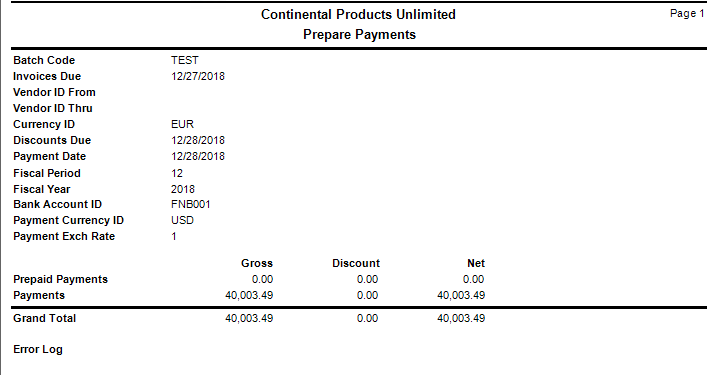 Note: The date you enter determines which invoices to prepare. Payments are prepared for invoices with a net due date before or equal to the date entered in this field. Also, the system prepares invoices on which the discounts due date, stored in the Open Invoice table, is less than or equal to the Invoices Due date entered on the Prepare Payments screen, but greater than the Discounts Due date entered on the Prepare Payments screen. - Select the range of vendor IDs to include from the Vendor ID From and Thru fields. If these are left blank all invoices, for all vendors, that meet the date criteria and have a status of Released will be prepared.