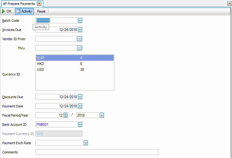 - If you use multicurrency, select the currency for the payments from the Currency ID table. The currency and the number of invoices for each currency will be displayed. This is available only if you have elected to use multicurrency.