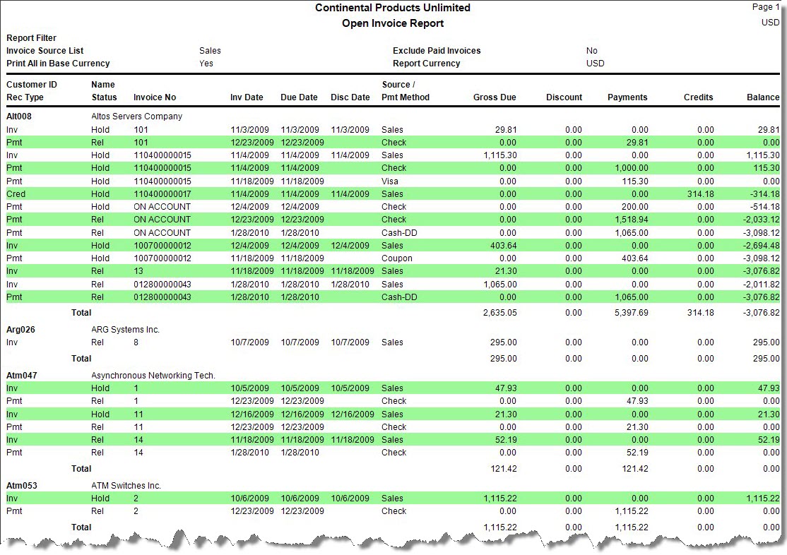The Open Invoice Report shows the amount due after you post transactions, a list of customers with open invoices, and summary invoice information. Balance forward customer information does not appear in this report. If you need a more detailed report for sales analysis, print the Detail History Report.