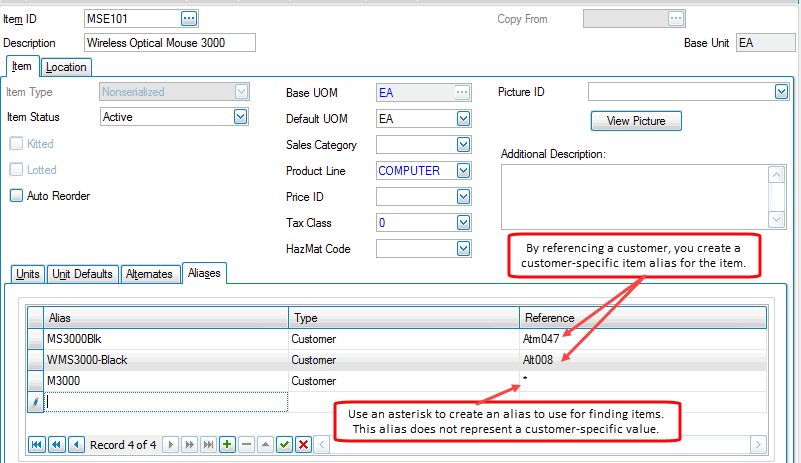 - When entering a customer item alias into the inventory item file, be aware that the most recent alias will be the one referenced in any sales orders, AR transactions, etc. If you have multiple customer part numbers (customer item aliases) for a single inventory item, the first alias ID alphabetically will be used.