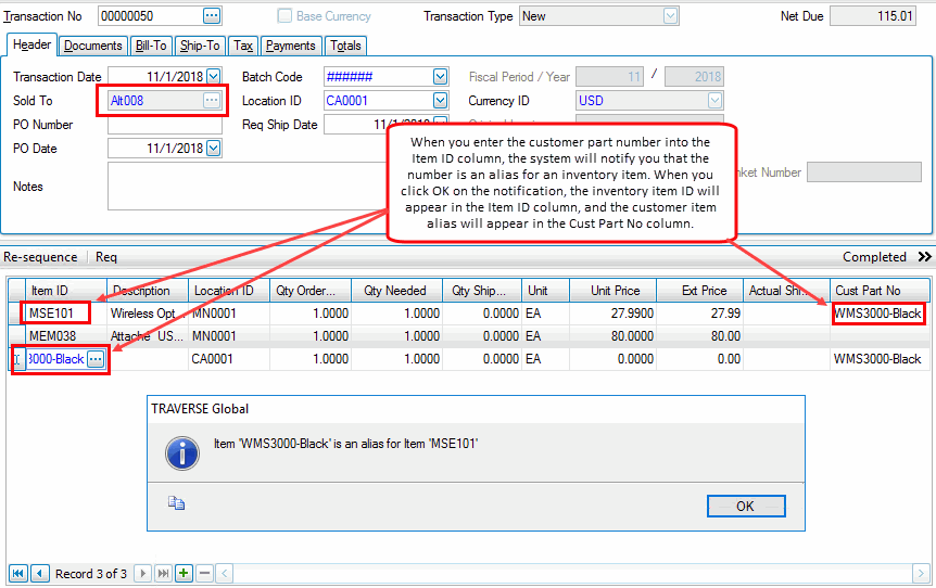If you have added the customer item alias into the item file via the item maintenance screen, to add the item to a sales order, AR transaction, blanket order, recurring order, etc. by using the customer part number, enter the customer part number into the Item ID column. A notification will appear to inform you the item is an alias for an inventory item. Click OK. The Item ID will show the inventory item number, and the Cust Part No will show the customer item alias.