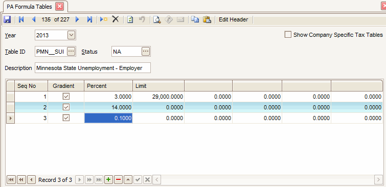 When the withholding code SUI for the state of Minnesota was set up in the Formula function, the formula PMN__SUI and the table PMN__SUI were assigned to SUI. The command f.TableValue(1,2) is used in the formula. The system returns 3.0000, the value found in the first row, second column of the table PMN__SUI.