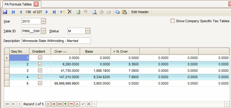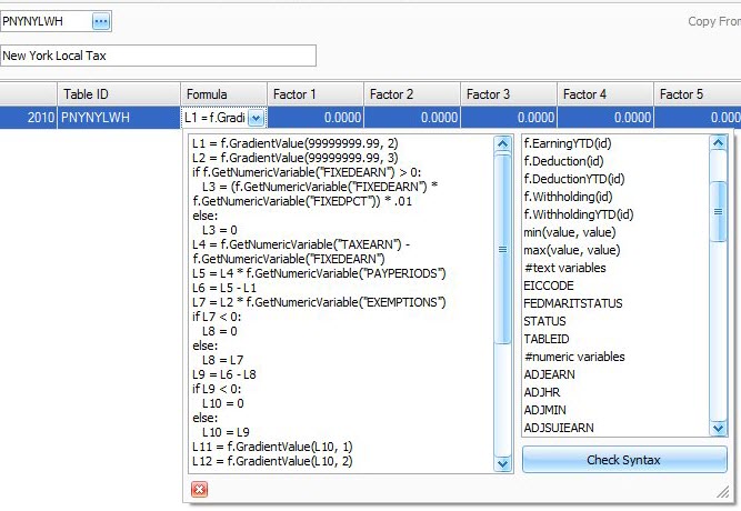 Use the f.TableValue(row, column) and f.GradientValue(value, column) functions to look up values in formula (tax) tables. Use the f.GradientValue function to look up information in a graduated tax table that has multiple rows or lines in ascending order, like the FED__FWH and PMN__SWH tables. The f.TableValue function is used to look up information in a table that is not arranged with graduated multiple rows, like a PMN__SUI table. Use the f.TableValue and f.GradientValue functions to have the formula look up values in formula tables that have been set up in the ST database (without the Show Company Specific Tax Tables box checked) and to have the formula look up values in formula tables that have been set up in the company database (with the Show Company Specific Tax Tables box checked).