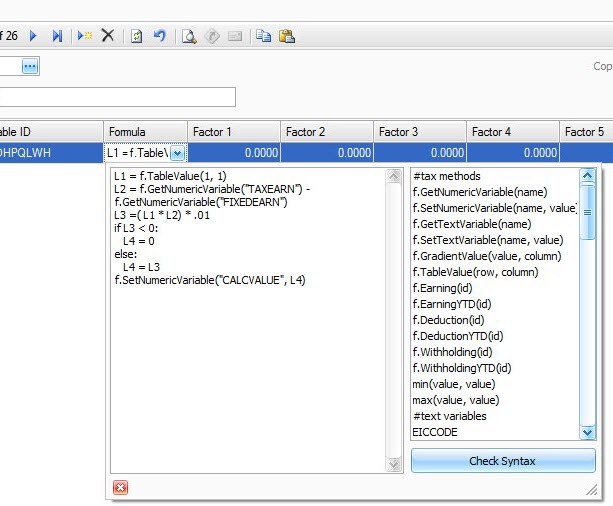 Example: In line 3 (L3) of the formulas displayed on the following screen, L3 stores the amount calculated in line 2 L2 of the formula. L1 is the amount retrieved for the table in line 1. (The table to be used with this formula is assigned when the withholding code is set up when you set up the tax authority). These variables are used to calculate an amount in line 3 and then that amount is stored as the variable L3 and used in the if, then, else statement that gives us our tax amount.