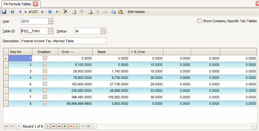 - To work with user-defined company-specific tax tables, check the Show Company Specific Tax Tables check box; otherwise, clear the box to work with federal and state tax tables pre-defined by the Payroll system. When the box is checked the new table added will be put onto the company database. With the box unchecked the new table will be put into the ST database.