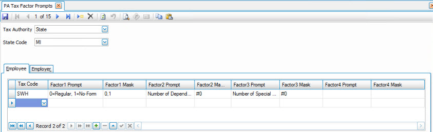 The Tax Factor Prompts are maintained for state taxes in the payroll year end updates distributed at the end of each calendar year. Local tax factor prompts are not maintained through the year end updates. When a federal, state or local tax that has a tax factor prompt set up is selected in the employee information setup you will be prompted to enter the factor amount when the record is saved. To enter the factor amount you must click on the Factor button. For more information on this see the Taxes tab in the Employee Information setup function.