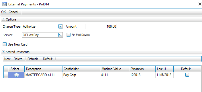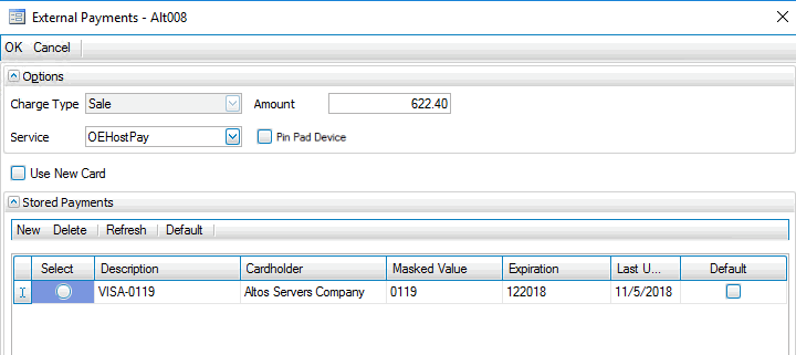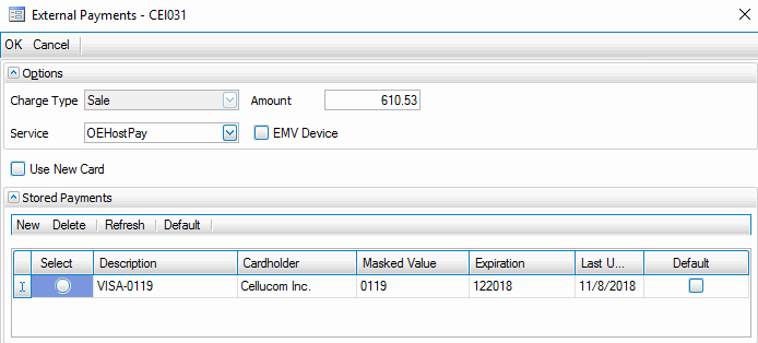 - When you click OK, the External Payment entry form for the customer will display. The stored external payment information will appear in the Stored Payments detail section of the screen. If there is no external payment method on file, click the New button to open a credit card information entry form.