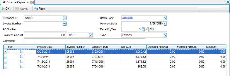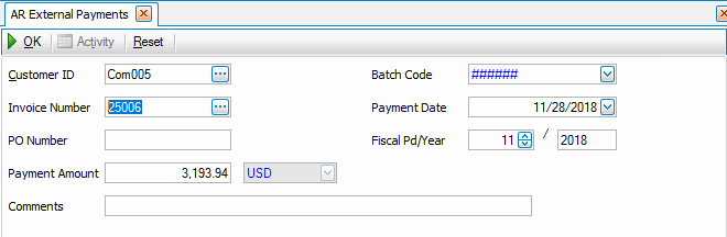 To use the External Payments function, select External Payments from the AR Transactions menu.
