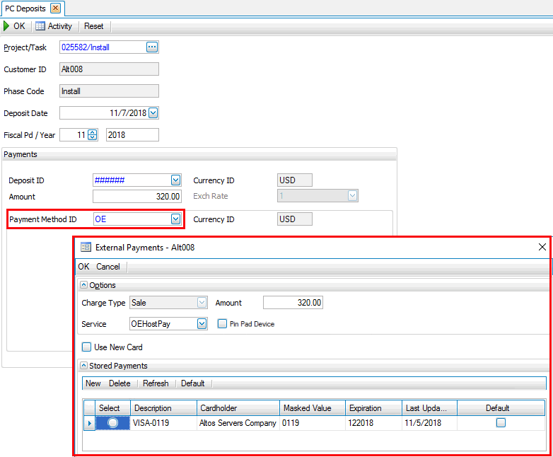 - Select a stored payment, then click the OK button to return to the PC Deposits screen. Click the OK button to process the payment. You can view the payment using the Project View or the Billing History View functions.