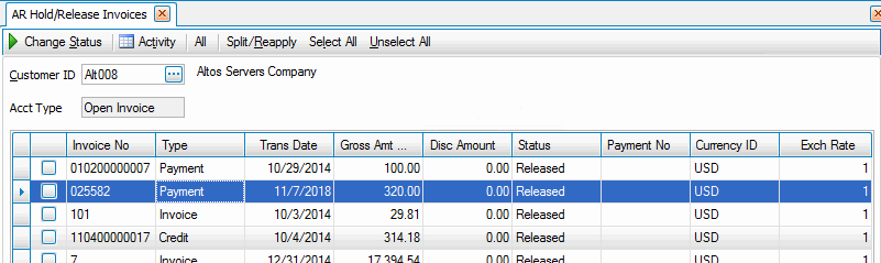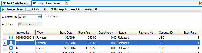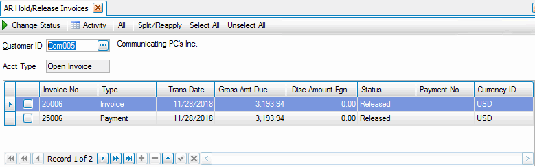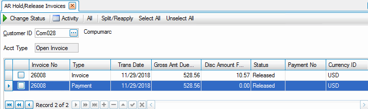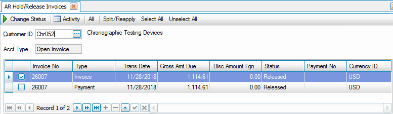- In the AR Hold/Release Invoices function, you will see the invoice and the payment.
