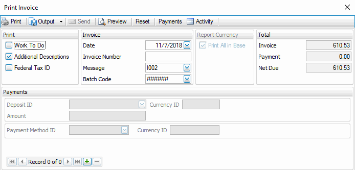 - Select an unpaid Invoice Number to process, or leave this field blank. Because you can apply payments 'On Account', no specific invoice number is required.