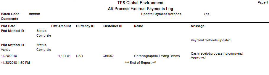 - Click OK to process the selected payment records. The Process External Payments log will preview.
