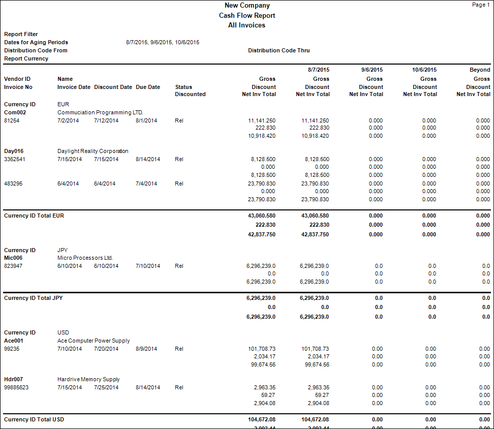 The Cash Flow Report shows the amount of cash you can expect to pay within any other three periods you specify. This information can help you project the cash position of your business and make sound payment decisions.