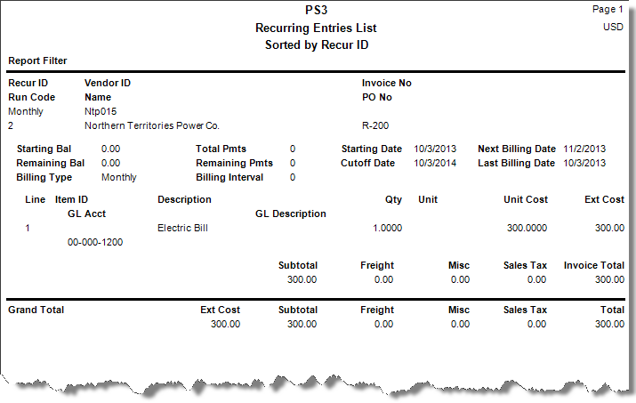 Use the Recurring Entries List function to produce a list of the recurring entries you defined in the Recurring Entries function.
