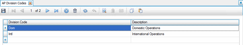 - Click the New button, on the toolbar, to open a blank division codes record.
