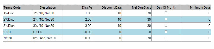 Use the Terms Codes function to add, change, or delete codes for vendor payment terms. These codes serve as a shorthand method of assigning particular conditions for doing business with a vendor. For example, you can assign a terms code with 10 discount days to one vendor and a terms code with 30 discount days to another vendor.