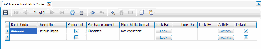 Note: If a batch posts unsuccessfully, the system locks the batch. When locked, you cannot enter, edit, or post the batch. To unlock a batch, click the Lock button. - Click the Save button, on the toolbar, to save any changes made to the batch code.