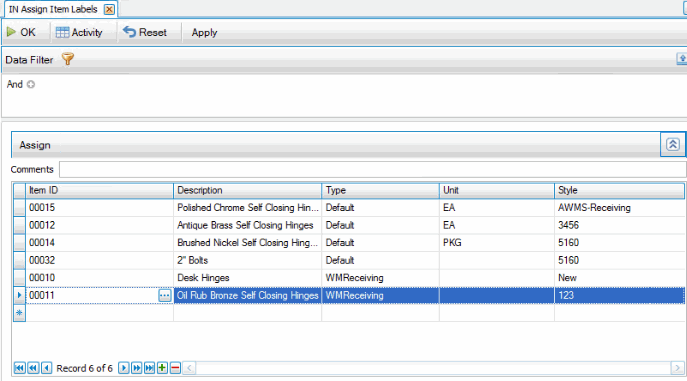 - Click Apply to see all records in the item label table that match the criteria. The results will populate the data grid.