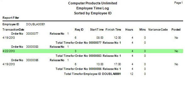 As you record time and activity information for specific employees, you may want to print a log that focuses on employee time rather than production results. The Employee Time Log provides you with the hours worked by employee. It also provides a preview of the data that will post to Payroll, if interfaced with Production.