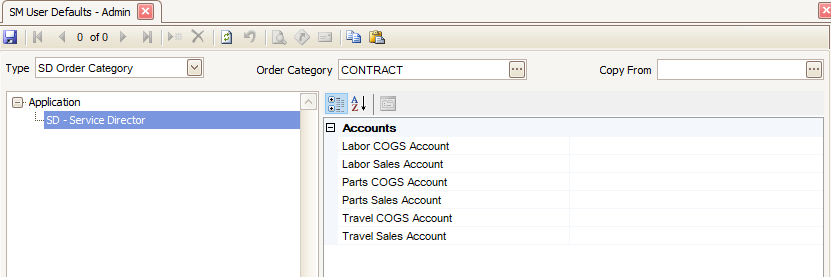 You can assign default COGS and Sales accounts for Labor, Parts, and Travel to a selected order category. These selections override the standard GL accounts at the time the transaction is entered. You can change these accounts if necessary at the time you enter the transaction.