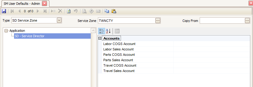 You can assign default COGS and Sales override accounts for Labor, Parts, and Travel to a selected service zone. These selections override the standard GL accounts at the time the transaction is entered. You can change these accounts if necessary at the time you enter the transaction.