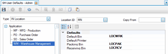 You can assign default bins (default, packing, receiving) to each inventory location. These selections override the default bins set up in the IN Location maintenance function. You can change these defaults if necessary at the time you enter the transaction.
