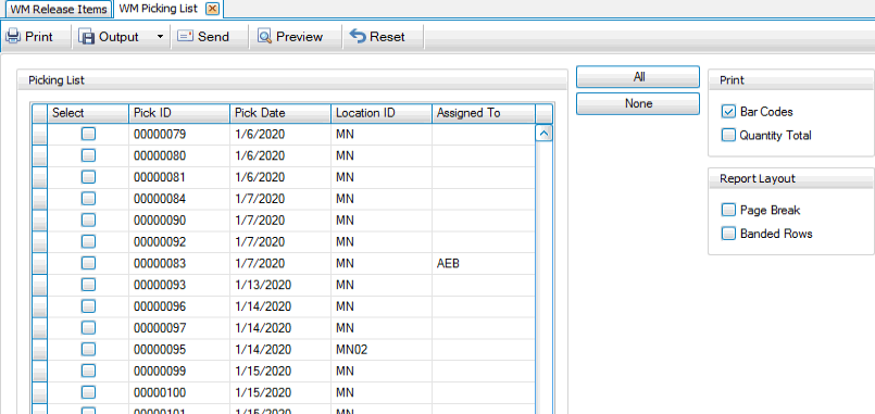 - The Picking List screen opens. Select the picking lists to print. Use the All button to select all released pick lists, or None to clear the check boxes.