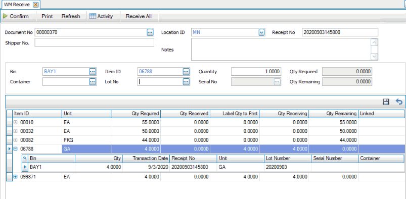 You must confirm the entries you have made before this function will update item quantities in Inventory and transactions in Purchase Order, Sales Order, Project Costing, MFG-Production, Warehouse Management or Shipments. When you click the Confirm button on the Receive screen, WMS updates item quantities and transaction status, as needed.