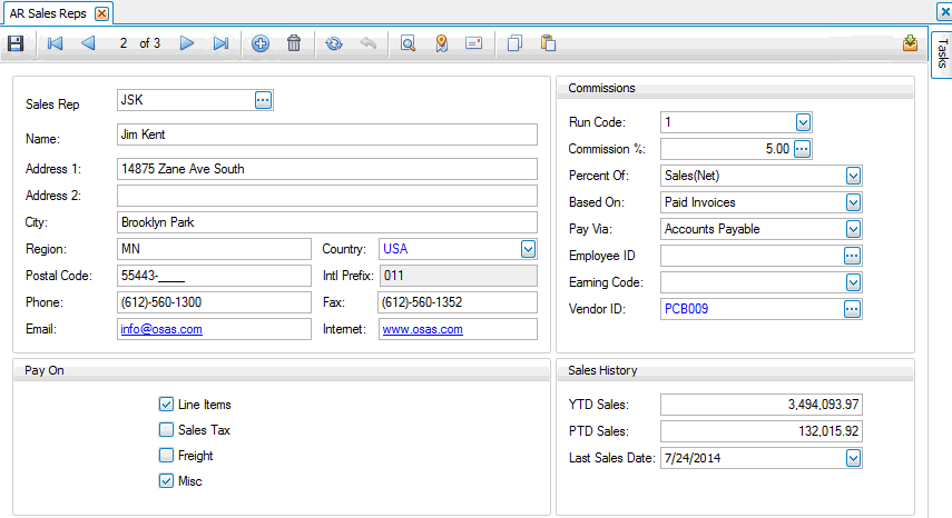 Use the Sales Reps function to setup sales rep IDs in order to track each sales rep's sales. Commissions can be paid on any combination of line items, sales tax, freight, or miscellaneous charges. Calculate commissions as a percentage of net sales or gross profits and base commissions on booked sales or paid invoices. Base commissions on booked sales or paid invoices.