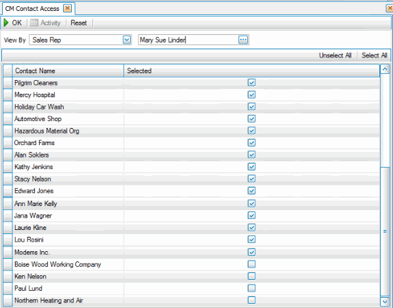 Note: Unselecting a check box will deny the sales rep access to the contact. - Click OK to process the contact access.