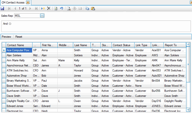 - Select whether to view access by Contact or Sales Rep from the View By field.