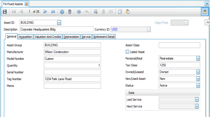 Use the Fixed Assets function to set up and maintain records for each asset. A record contains general information, as well as information on acquisition, valuation and credit, depreciation, service, and retirement.