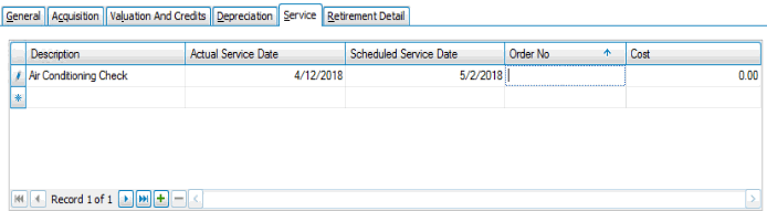 - If Service Director is interfaced with Fixed Assets, entries in the Order No field will be populated from Service Director for service work performed on assets.
