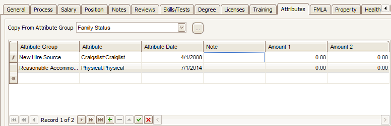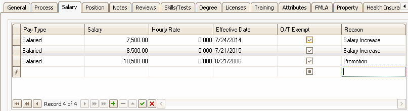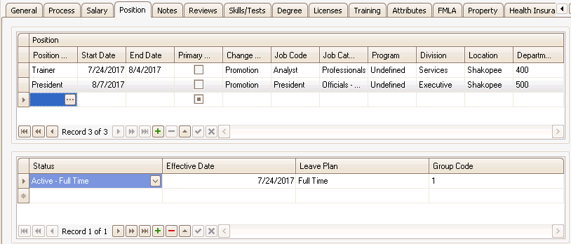 The Position and Status screen tracks changes in the individual’s job category, job title, and department, promotions, and changes in status (full time, part time, terminated, etc.). All of these changes are date stamped.