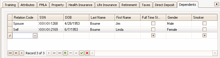 The information on the Dependents tab is used for Life Insurance and Health Insurance plan enrollment. Up to one spouse and any number of children can be entered.