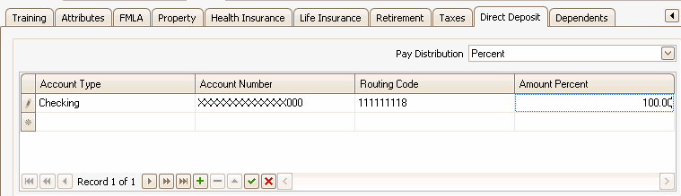 Direct Deposit settings can be maintained through HR and updated into Payroll. Enter checking and savings account information for direct deposit of paychecks under the Direct Deposit tab. Each employee is allowed up to 6 distributions. For further information on entering direct deposits, consult the Traverse Payroll help topics.