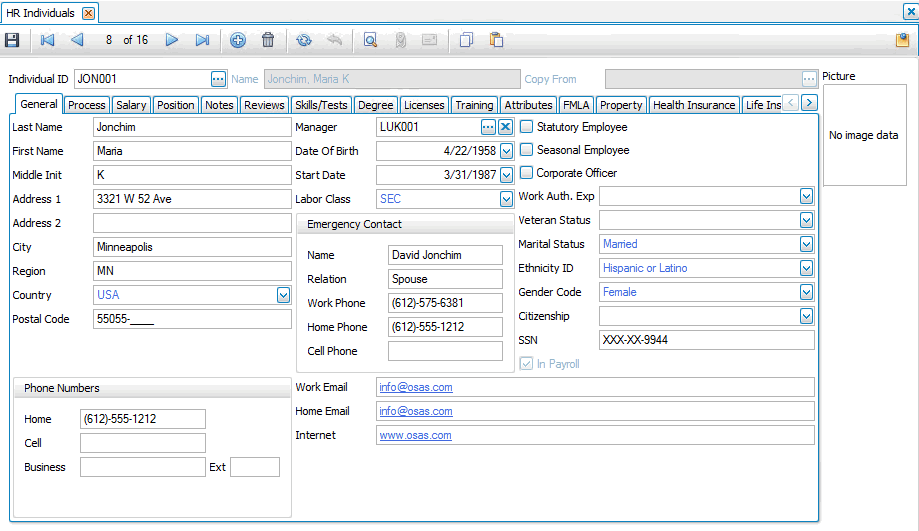 The General tab of the Individual Maintenance function captures information such as name, address and phone number, emergency contact information, ethnicity, gender, veteran status, etc.