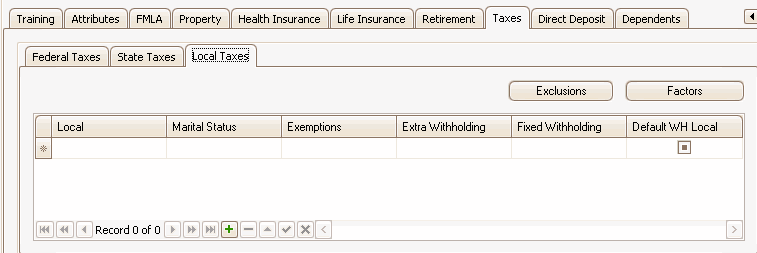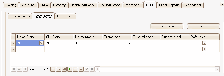 Use the Exclusions and Factors buttons under the Federal and State tabs to exclude earnings and deductions from employee- and employer-paid taxes and to set up override factors. If an employer is not subject to a certain federal, state, or local tax for a particular individual, use the exclusions dialog box--Employer Tax tab to exclude the tax from the employer.