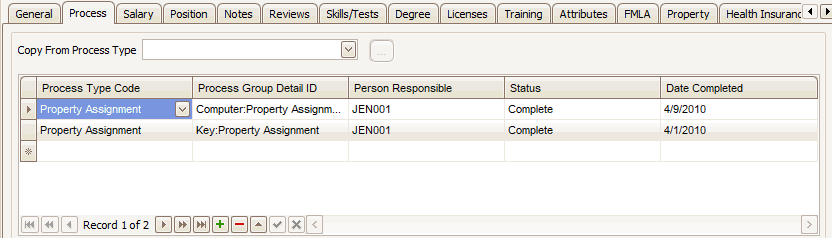 Use the Process tab to organize and track tasks for various processes including new hire orientation, exit interview or property assignment. You can define an unlimited number of processes.