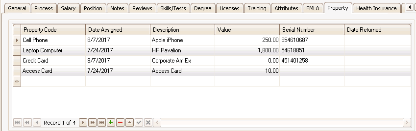 The Property tab tracks company property that has been assigned to an individual.