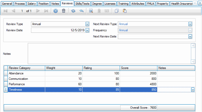 Use the New button on the tab's toolbar to record a new review, or you can modify a review already entered. An individual can have multiple reviews.