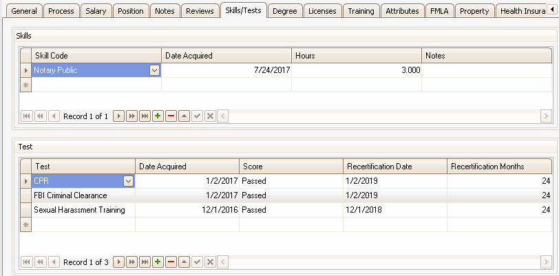 The Skills/Tests tab tracks an individual's skills as well as tests the person has taken, along with dates and scores.