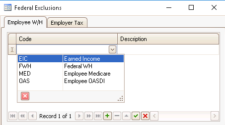 Click the Exclusions button and select a Code from the drop-down list on either the Employee W/H tab or the Employer Tax tab.