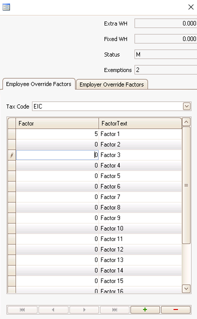 Then click the Factors button and select the same code from the Tax Code drop-down list under the Employee tab or the Employer tab. Enter an override Factor.