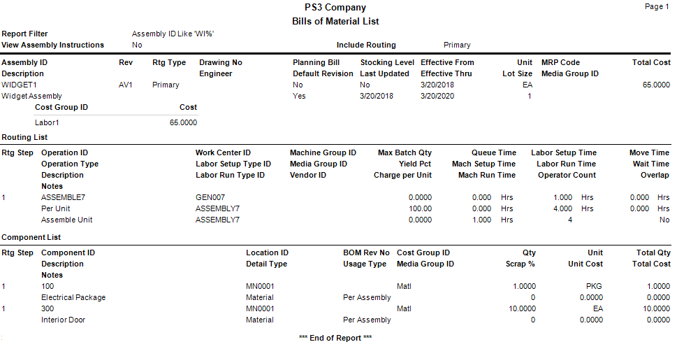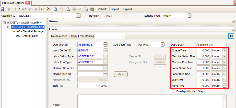 A bill of material (BOM) can contain any number of routing operations. Each routing identifies the details associated with a specific process or operation, including a set of time requirements necessary for completing the process. Each of the time values are considered a cumulative value necessary for completing the given process. The cumulative time values are also used to evaluate the costs associated with the relative portions of the routing (Machine, Labor, etc).